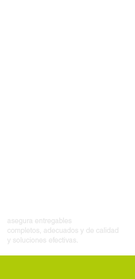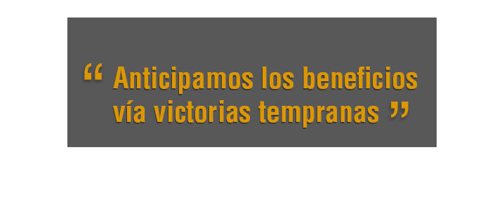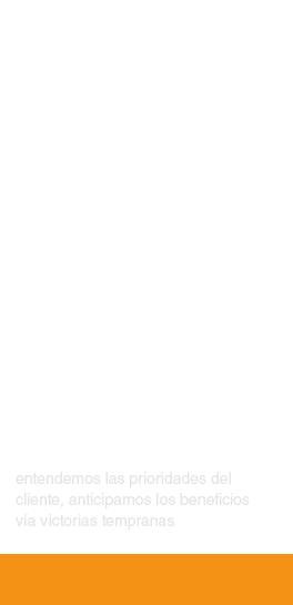 Servicio integral de consultoría: entendemos las prioridades del cliente. Anticipamos los beneficios vía victorias tempranas, consideramos múltiples aristas: gente, procesos, métricas, cliente y tecnología. Nuestra experiencia teórico-práctica asegura entregables completos, adecuados y de calidad y soluciones efectivas.